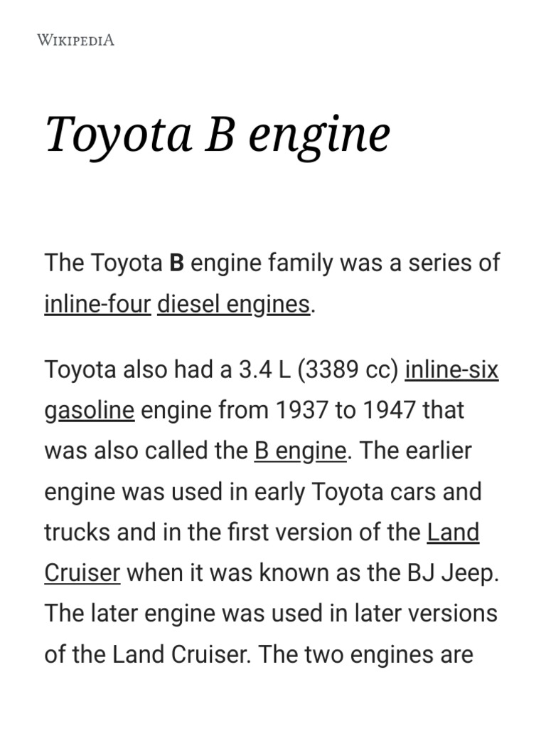 B toyota engine. The later engine was used in later versions of the land cruiser. Toyota also had a 34 l 3389 cc inline 6 gasoline engine from 1937 to 1947 that was also called the b enginethe earlier engine was used in early toyota cars and trucks and in the first version of the land cruiser when it was know as the bj jeep. The type a engine was a straight six engine produced from 1935 through 1947 by toyota.